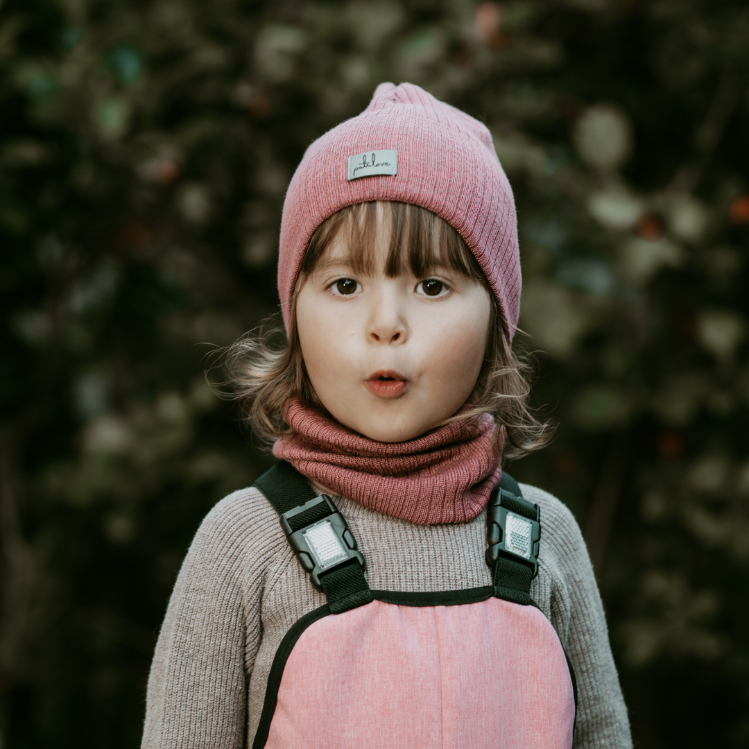 Un set di lana sottile per tutto l'anno per il vostro bambino: un berretto elastico e uno scaldacollo aderente in 100% lana merino.