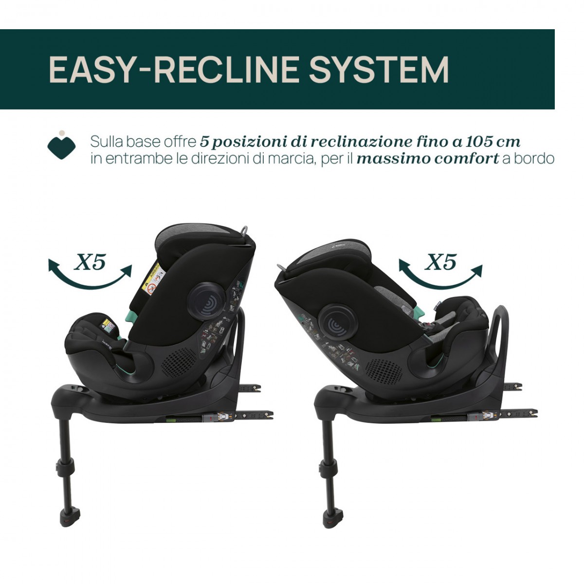 Sulla base rotante, puoi posizionare comodamente il tuo bambino nella posizione a 90°, sia in senso contrario che in senso di marcia fino a 105 cm (circa 4 anni). L’utilizzo prolungato in senso contrario di marcia fino a 105 cm offre una maggiore protezione per collo e testa in caso di impatto.